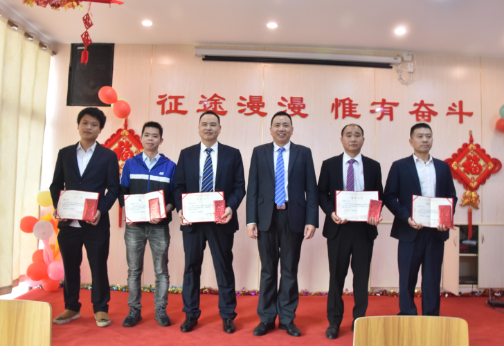 營(yíng)銷(xiāo)部經(jīng)理伍綱強(qiáng)為邱高明、周美芳、黃榮先、龔超頒發(fā)先進(jìn)個(gè)人獎(jiǎng)